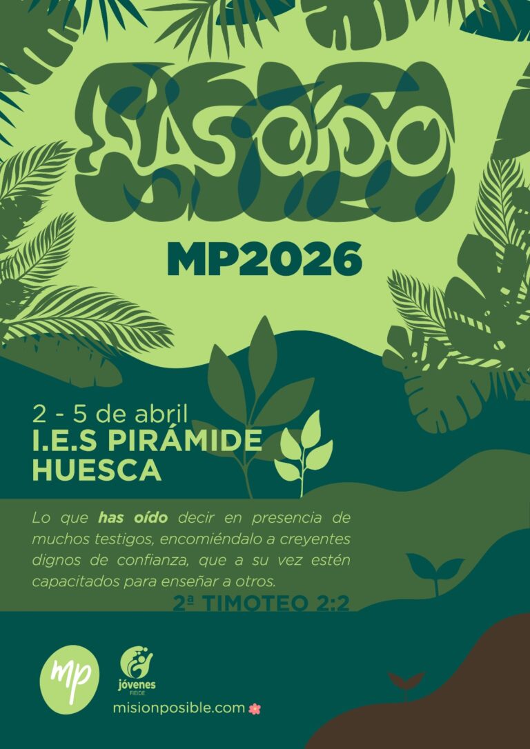 MISIÓN POSIBLE es un evento creado por y para jóvenes. Organizado por la FIEIDE (Federación de Iglesias Evangélicas Independientes de España), se celebra cada dos años durante Semana Santa y está abierto a jóvenes de todas las Iglesias de España.